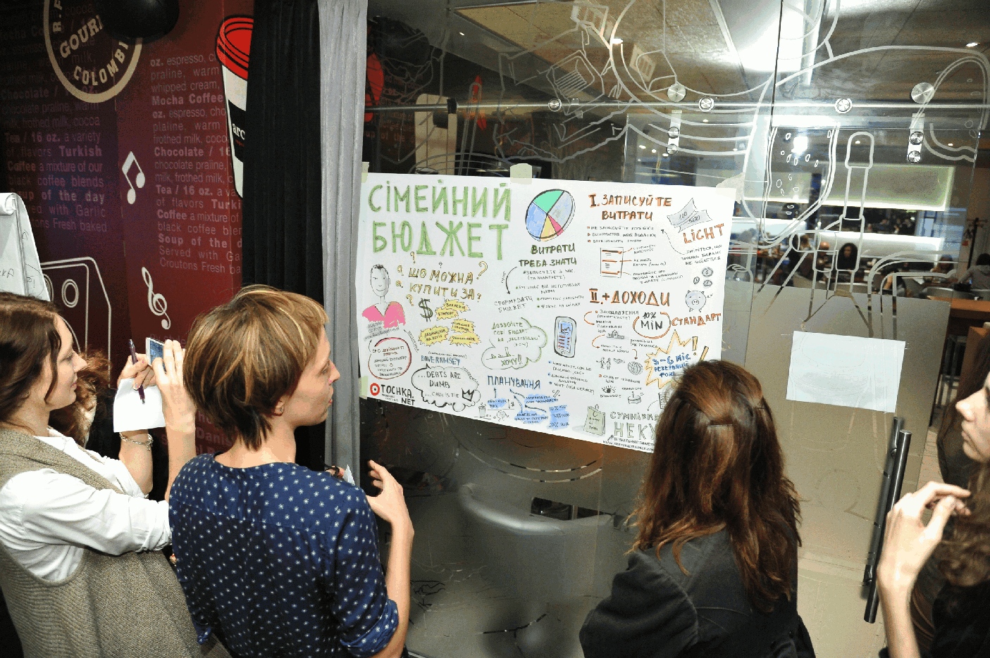 Дуже класною ідеєю виявилась візуальна фасилітація, яка організувала засновник блогу про візуальні замітки Анна Юрченко. Більше про її роботи та техніку дивіться на http://tips.sketchnotespace.com/